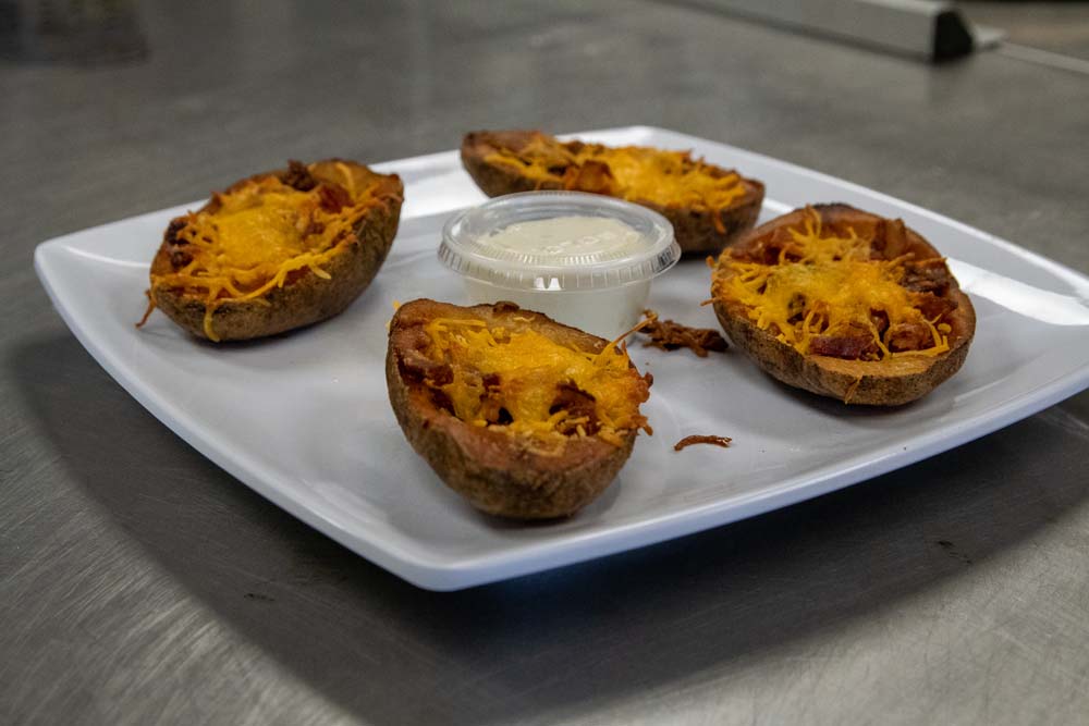 Taco seasoned ground beef, diced tomatoes, green peppers and onions over a bed of tater tots, smothered with enchilada sauce, melted cheddar and mozzarella cheeses. Served with sour cream on the side.